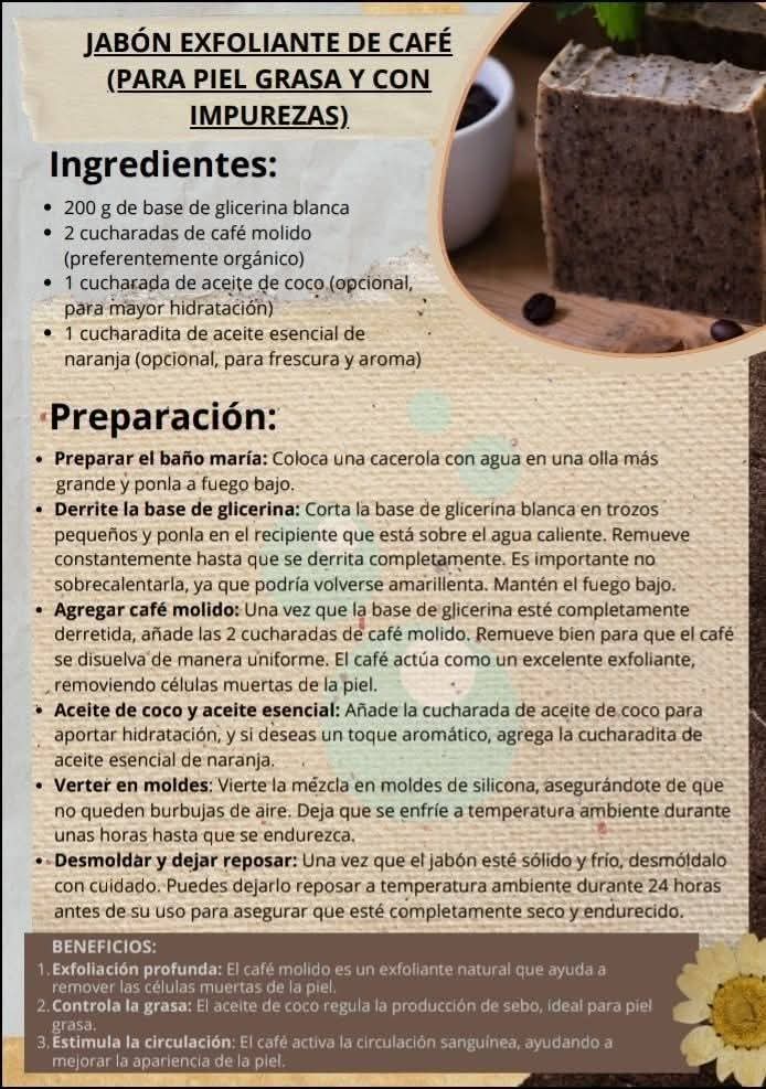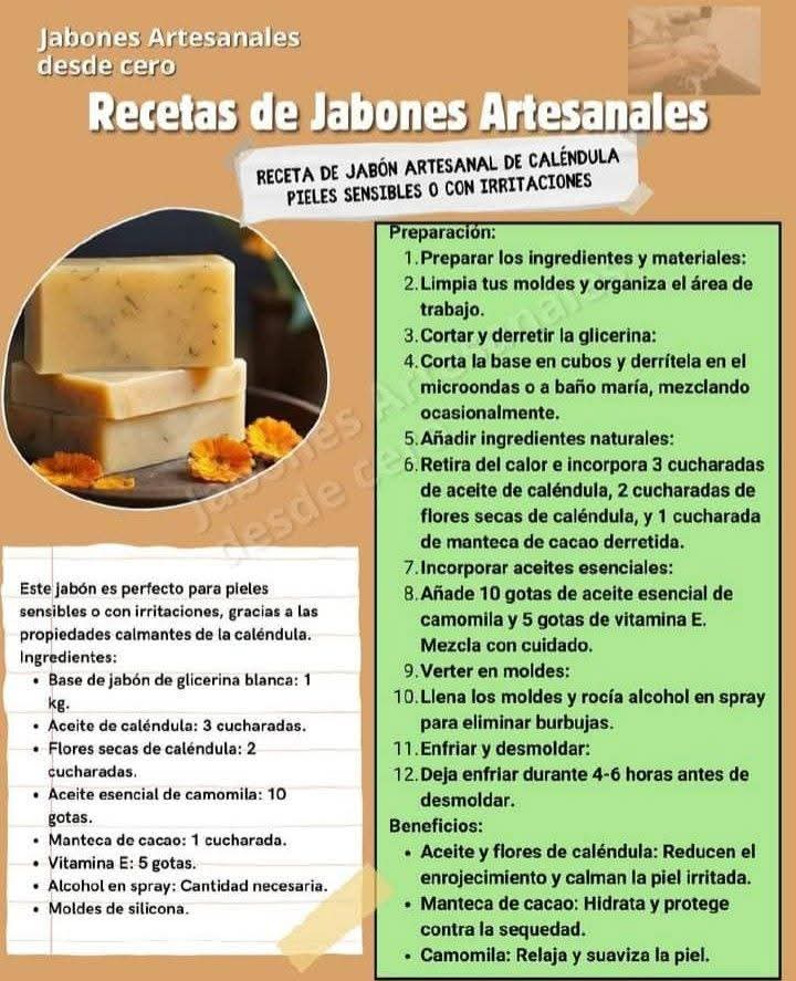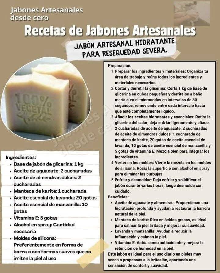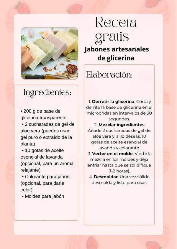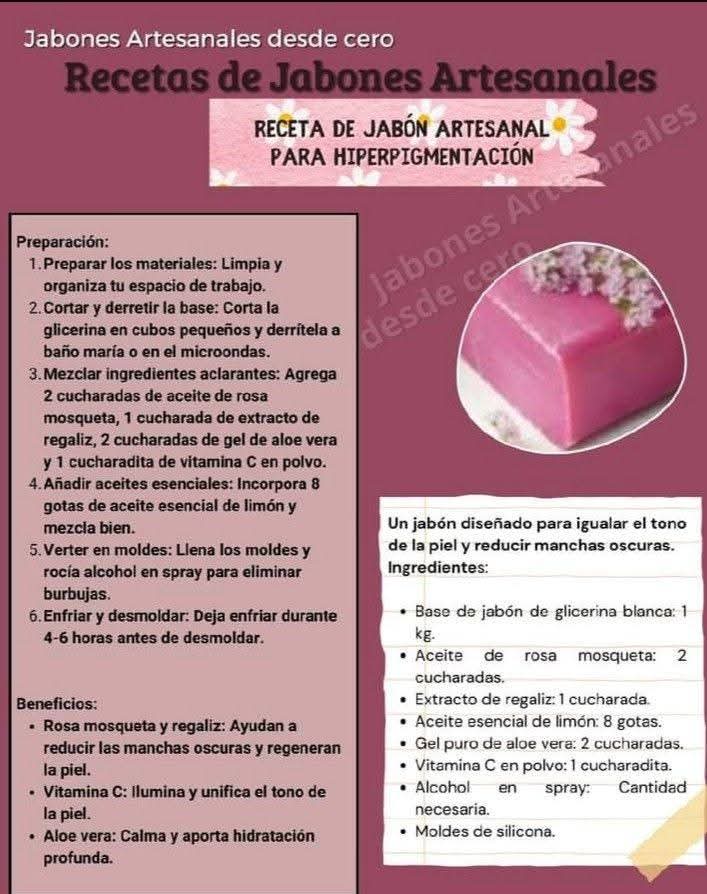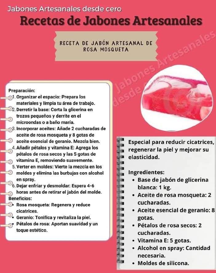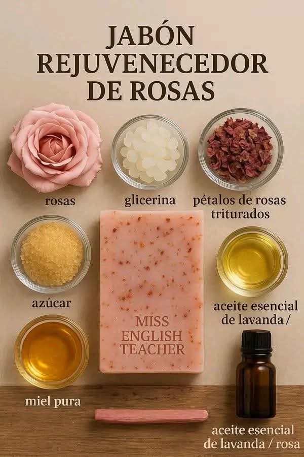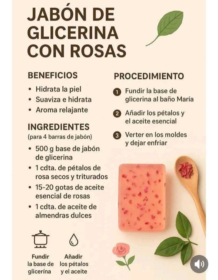 ⸻👣 Preparación paso a paso 1. Derrite la base de glicerina a baño maría. 2. Cuando esté líquida, añade miel, aceite de almendras y el azúcar. 3. Mezcla suavemente hasta integrar. 4. Añade los pétalos de rosas triturados y vuelve a mezclar. 5. Agrega las gotas del aceite esencial elegido. 6. Incorpora el conservante y mezcla nuevamente. 7. Vierte en moldes de silicona. 8. Deja reposar hasta solidificar completamente. 9. Desmolda y guarda en un lugar fresco y seco.