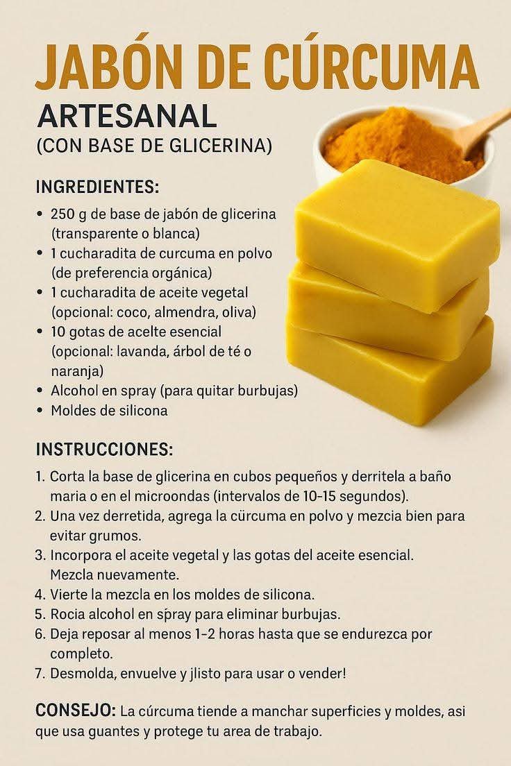 Agrega la cúrcuma en polvo poco a poco, mezclando de manera constante para evitar la formación de grumos. La cúrcuma aportará un color cálido al jabón y sus propiedades antioxidantes beneficiosas para la piel.